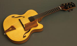 Engelmann spruce top, bigleaf maple back and sides, cocobolo binding and appointments. Varnish finish with French polish,