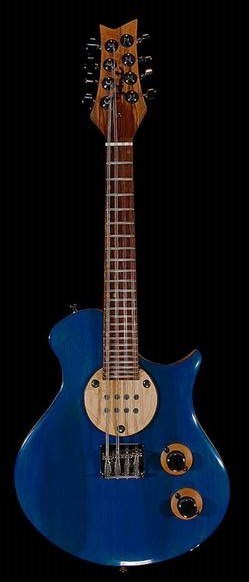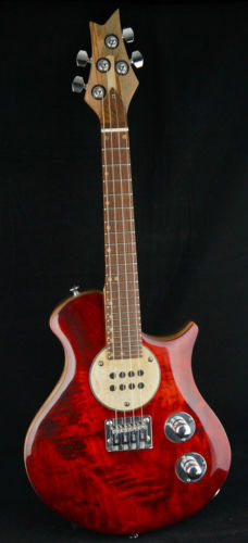 pickups. Center: solidbody 4-string with figured maple/Spanish cedar body, maple/ambrosia maple neck, Madagascar rosewood fretboard with