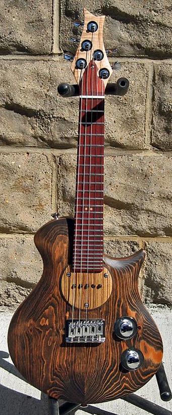 old Douglas fir, Spanish cedar, maple and padauk. Bottom: lefty 4-string.