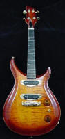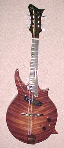 Jonathan Mann On the left, a wicked electric 8-string, semihollow FM-5E "Manndolin" by this Tennessee luthier. It has a through-body, three-piece maple/walnut/maple neck, quilted mahogany "wings," banjo frets, Grover tuners, and a flame redwood top. The peghead overlay is flame walnut, and the ebony fretboard has a 12" radius. In addition to the Joe Barden blade humbucker, there's a Fishman piezo in the bridge. The electronics are switchable, so you can either run the two signals in stereo or combine them into a mono signal with an onboard L. R. Baggs control-X preamp/blender system. In the center is Jonathan's EM-5 5-string mandolin, and here's my review. On the right is his latest and greatest: the double-cutaway SEM-4. |