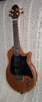 is a hobby builder, and here's one of his solidbody mandolins. Neck and body are solid mahogany, with rosewood fretboard and peghead overlay and Bill Lawrence dual-coil split-rail pickup. Control pots are Radio Shack parts; the scale length is 14"; and the tuning machines are gold-plated Gotohs.