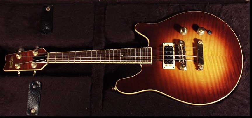 The hollow acoustic/electric Washburn on the right looks fairly recent, and may even be currently in production for all I know. Washburn did make a few solidbody electrics, like the 4-string instrument above, in the 1960s and '70s.