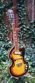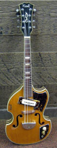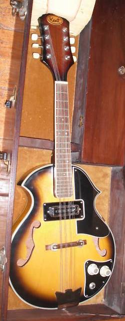 Below are three examples of the Kent 836, the odd "violin-shaped cutaway" model from the 1967 catalog. What were they thinkin'? Since we know that it exists in blond, sunburst, and red, it's reasonable to assume that there are white ones as well, but I have yet to see one. Below that are some examples of more generic-looking e-mandos with the Kent brand. The KayKraft copy with the white pickguard is from the early 1960s, and it's reasonable to assume that the other instruments in that row are of similar vintage—i.e., before the more distinctive 1967 designs were developed. That KayKraft model sports an Italian-built Eko pickup, but the proprietary pickups on the later models are considered quite collectible by those who collect pickups. There was even an after-market Kent mandolin pickup similar to the DeArmond. Bluegrass great Jesse McReynolds reportedly did some recording with a Kent electric mandolin. For more info about Kents, visit Bob Gatewood's Kent collection page. For other examples of Japanese e-mandos, see Kingston, Conqueror, Bruno, and San Remo. ![]() ![]() ![]()