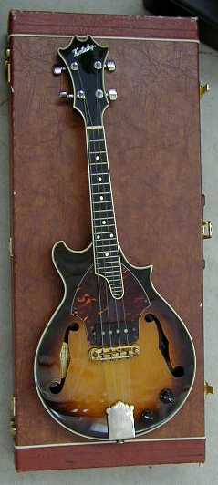 pickup in the neck position. Below: Two electric Kentucky models were sold during the 1980s. The KM-400E (left), a semi-hollow 4-string model, was the more expensive of the two; the KM-300E (right) was a solidbody 5-string. I once owned an example of the latter and was never completely happy with it. Your mileage may vary. John Baxter, proprietor of the MandoZine Web site, owns a KM400E (in fact, that's his in the picture). Both models were discontinued several years ago and are hard to find.   photo: Ted Silverman     |