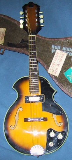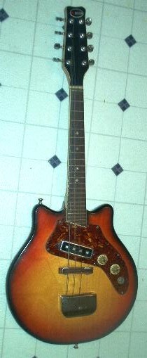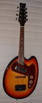 The Nagoya Music Factory also produced the Bruno and the Conqueror; however, the Conqueror trade name did not exist until late 1966. Both instruments share the same neck style; the Kingston has symmetrical body horns whereas the Conqueror has a larger horn on the bass bout. The crucial difference, however, is in the pickup. The early Kingston has a chrome pickup with a piece of gold foil on the face with four screws. The magnets actually have a wire bobbin wound around them. The pickup on the Conqueror had a bobbin that was first wrapped around a plastic sleeve before being slipped over the magnetic pole pieces. Japanese instruments made at other factories include the Kent and San Remo electrics. The Kingston in the center was clearly inspired by the similarly shaped "mandoguitars" built by Vox. It reportedly never caught on because the neck was too narrow to play comfortably. Michael Spicer of Canada has built some mandolins similar to this one. Next, another of the ubiquitous Japanese KayKraft copies. You know the drill... ![]() |